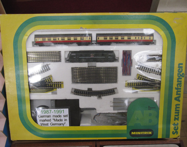 Minitrix set with BR Warship diesel and red/cream coaches.