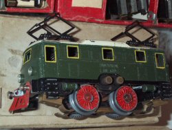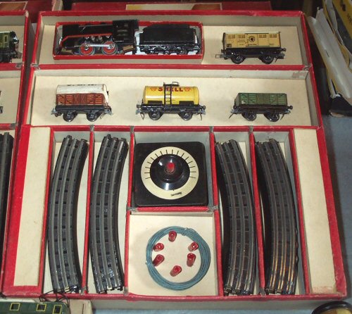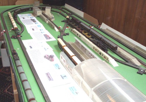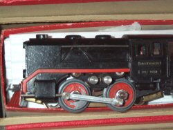 On David's table were two rare Trix Express American sets. The locos in these sets are the very early type with disc wheels. Locos exported to the USA have a red tinplate cowcatcher mounted at the front.