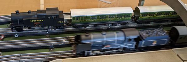 The large Toad Hall Dublo layout had many Trix locos running, including 0-6-2 tanks, Class V, Britannia, and EM1s