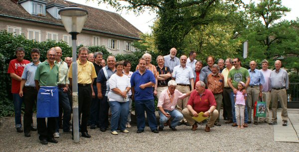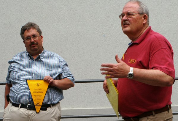 Event organiser, Jean-Patrick Enz (on right), awarding a special "Champions" flag to Benno Fässler for attending his 10th Zurich GTG.